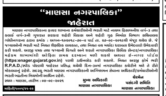 It is a good opportunity for all the interested candidates who are looking jobs in Mansa Nagarpalika . Before applying for the post, candidates should ensure that he/ she fulfills the eligibility criteria and other conditions mentioned in this advertisement. The last day for registration is 04-10-2021. Candidates are advised to carefully read the full advertisement for details of educational qualification and other eligibility criteria before submission of application. more detailed information regarding educational qualification, age limit,selection procedure, how to apply ,last date for Mansa Nagarpalika Recruitment 2021 are mentioned below.Mansa Nagarpalika Recruitment 2021